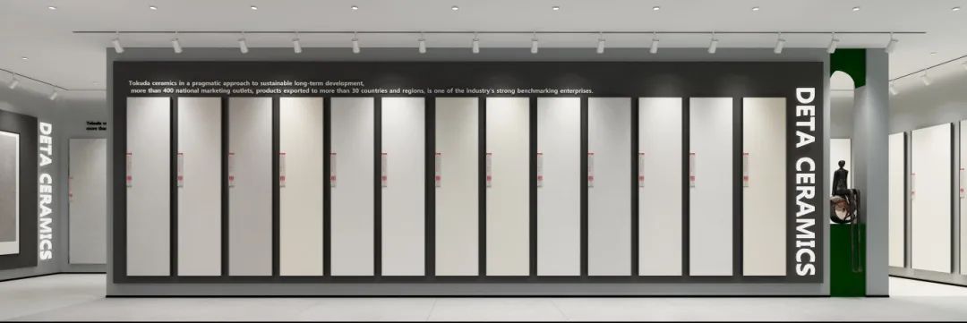德田陶瓷全新終端SI形象標準,將展廳的動線布局與現代美學手法相結合,在燈光的映襯下,通過明暗對比分割空間,利用空間分隔和材料元素的構型立意,將產品融入到空間的細膩表達中,增強客戶的體驗感。